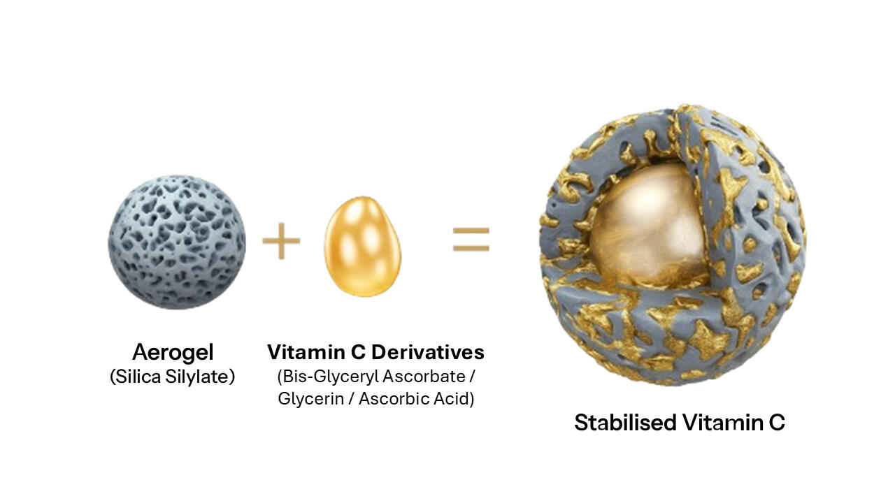 Silica aerogel: Keeps vitamin C stable and active, preventing oxidisation and colour change until applied to skin.